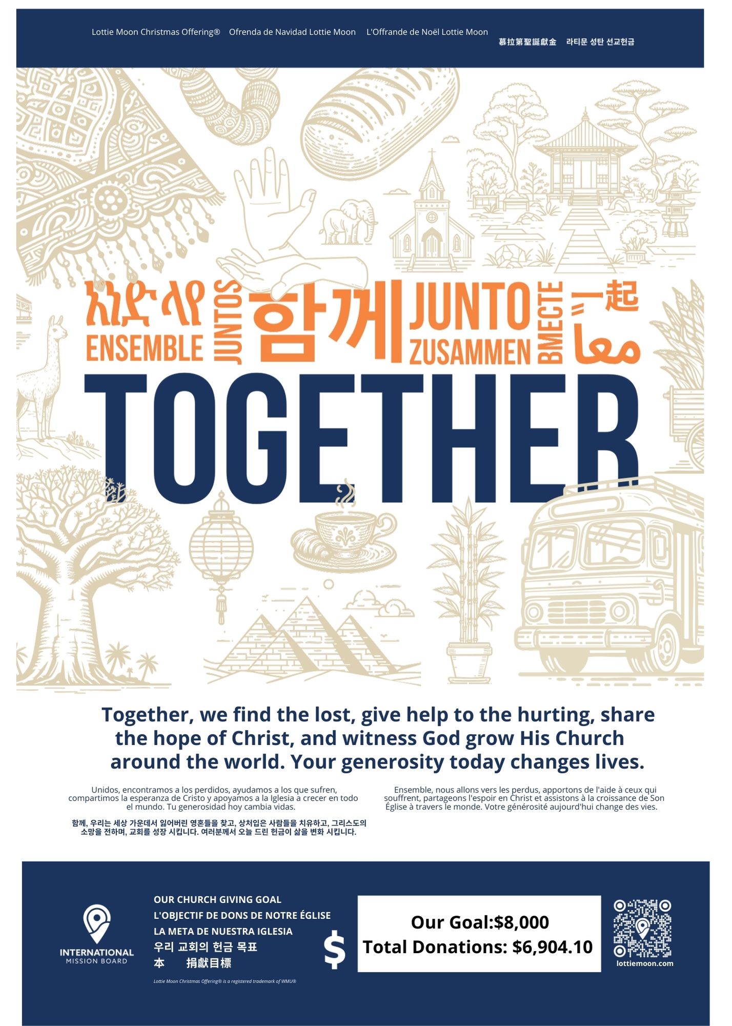 This Sunday, we will be collecting our annual Lottie Moon Love Offering for the missionaries of the IMB. 100% of the offering goes directly to those in the field.