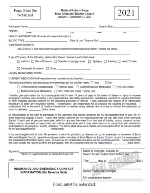 Click on the button below to open a PDF copy of the Byne Medical Release Form. Form must be notarized.